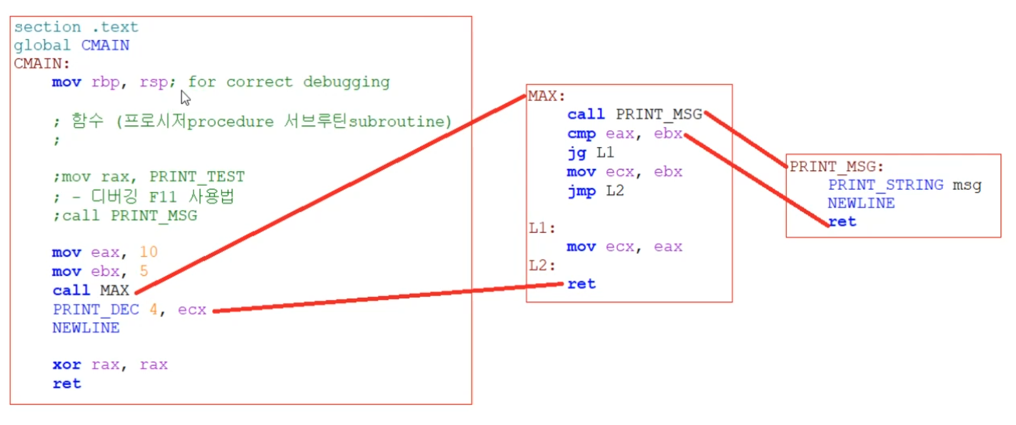 1 2 3 4 5 6 7 8 9 10 11 12 13 14 15 16 17 18 19 20 21 22 23 24 25 26 27 28 29 30 31 32 33 34 35 36 37 38 39 40 41 42 43 44 45 46 47 48 49 50 51 52 53 54 55 56 57 58 59 60 61 62 63 64 65 66 67 68 69 | %include "io64.inc" section .text global CMAIN CMAIN: mov rbp, rsp; for correct debugging ; 함수 (프로시저 procedure 서브루틴 subroutine) ; call PRINT_MSG mov eax, 10 mov ebx, 15 call MAX PRINT_DEC 4, ecx NEWLINE xor rax, rax ret PRINT_MSG: PRINT_STRING msg NEWLINE ret ; ex) 두 값 주 ㅇ더 큰 값을 반환하느 max ; 근데 2값을 어떻게 남겨받지? 반환 어떻게? ; eax와 ebx 입력값을 ecx에 반환 MAX: cmp eax, ebx jg L1 mov ecx, ebx jg L2 L1: mov ecx, eax L2: ret ; 그런데 인자가 10개라면 어떻게 할까? a b c d ; eax, ebx에 이미 중요한 값이 있으면 어떻게 할까? ; [!] .data .bss 사용하면? ; 인자를 도대체 몇개를 할당해야 하지? ; 다른 메모리 구조가 필요하다 ; - 꿈의 유효한 동안에는 그 꿈을 유지시켜야 함.(유효 범위의 개념이 있다) ; - 꿈이 끝나면 그 꿈을 부셔버려도 됨 (정리의 개념이 있다) ; - 꿈에서도 또 꿈을 꿀 수 있다는 것을 고려해야 함 (유동적으로 유효 범위가 확장 가능) ; [!] 스택(stack)이라는 메모리 영역을 사용 ; 함수가 사용하는 일종의 메모장 ; - 매개 변수 전달 ; - 돌아갈 주소 관리 ; 초기화 되지 않은 데이터 ;[변수이름] [크기] [개수]` ;[크기] resb(1) resw(2) resd(4) resq(8) section .data msg db 'Hello World', 0x00 ; 초기화 되지 않은 데이터 ;[변수이름] [크기] [개수]` ;[크기] resb(1) resw(2) resd(4) resq(8) section .bss e resb 10 | cs |