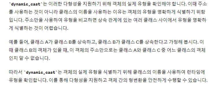 dynamic_cast ⇒ 비용이 높기 때문에 (클래스의 이름 비교를 수행)