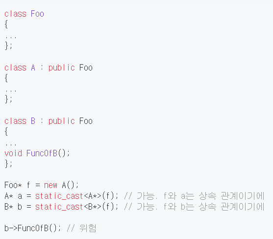 - static_cast는 컴파일 시간에 캐스팅을 진행하기 때문에 런타임 중 변경된 타입이 유효한지 검사하지 않기 때문