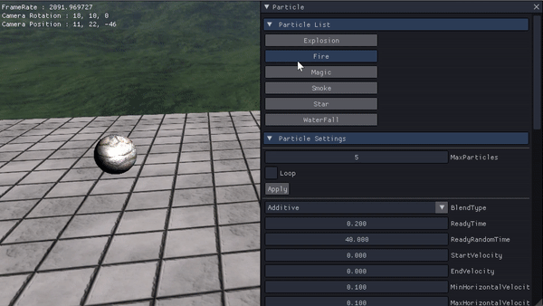 파티클 편집기에는 일반적으로 개발자가 파티클 시스템을 시각적으로 만들고 수정할 수 있는 시각적 편집기가 포함되어 있다. 일반적으로 크기, 색상, 불투명도 및 수명과 같은 입자 속성에 대한 제어를 제공하며 개발자가 입자 시스템의 동작 및 모양을 실시간으로 조정할 수 있다. 또한 DirectX11의 Particle Editor는 개발자가 입자에 이미지를 적용할 수 있는 텍스처 매핑 및 고급 물리 시뮬레이션과 같은 기능을 제공하여 보다 현실적인 입자 효과를 생성할 수 있다.