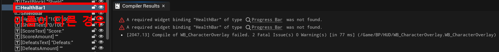 코드에서 HealthBar이라고 선언한 변수를 위젯블루프린트에서 HealthBar1이라고 다른 이름으로 작성하면 binding 되지 않아 위와 같이 위젯블루프린트에서 컴파일 에러가 발생한다.