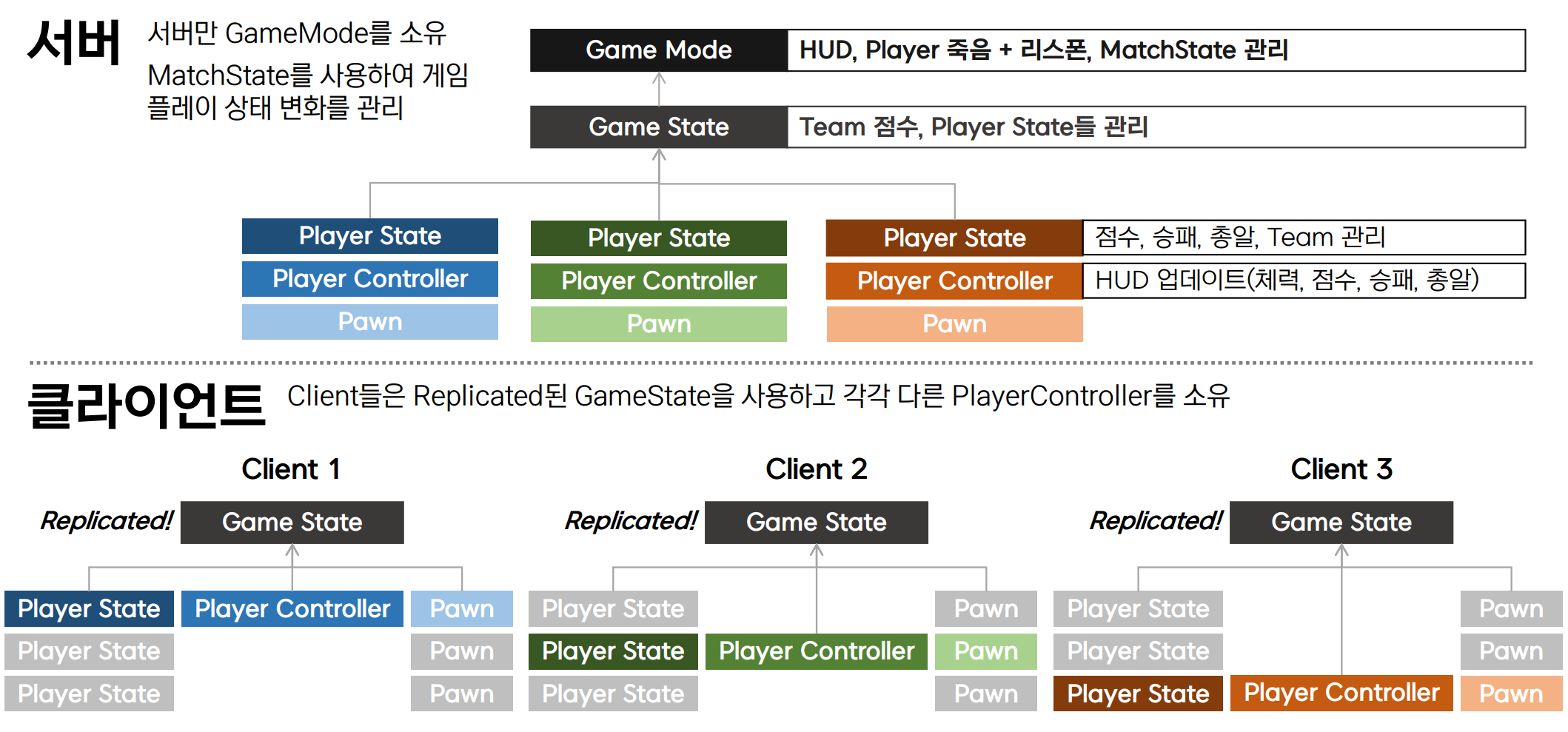 | GameState | GameMode가 정의한 규칙에 따라 게임의 현재 상태를 추적 게임 상태는 모든 클라이언트에 복제 |