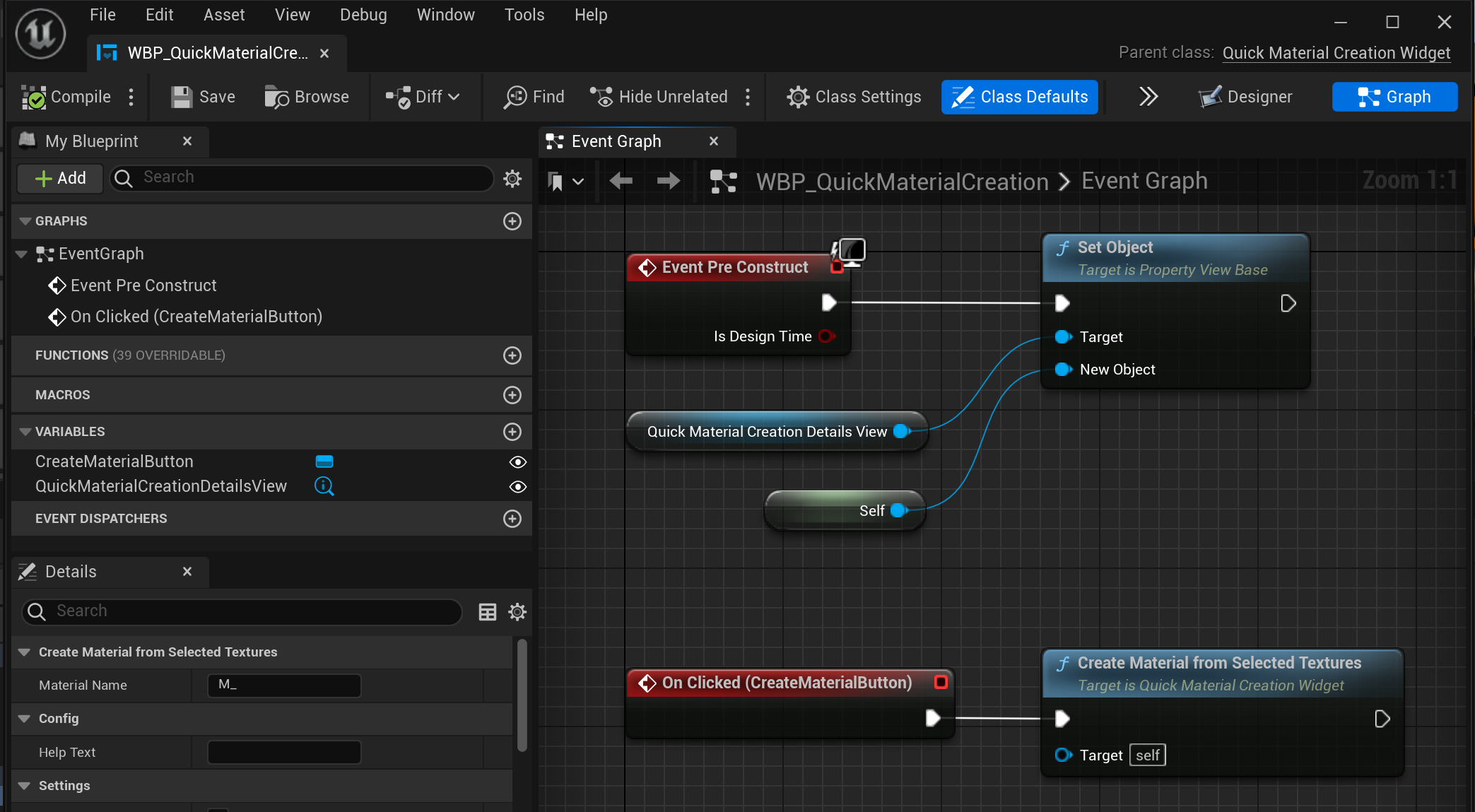 QuickMaterialCreationWidget 클래스 기반의 WBP_QuickMaterialCreation 생성