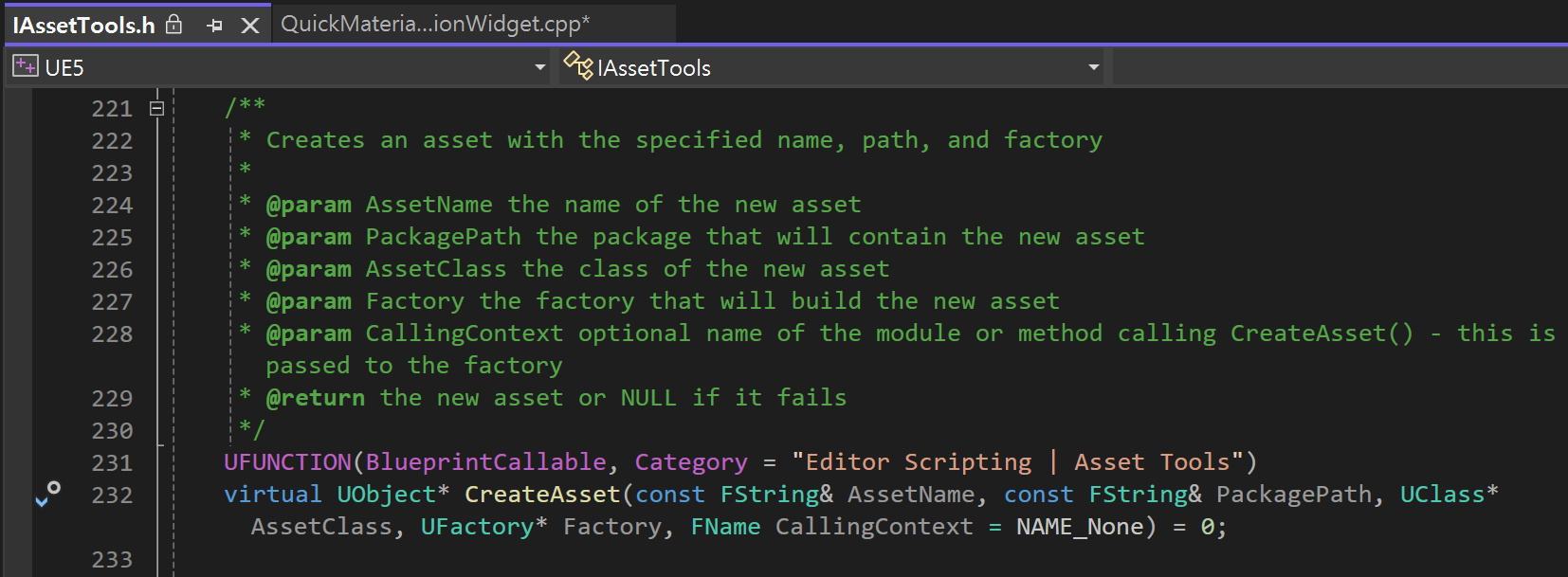 TObjectPtr<UObject> CreatedObject = AssetToolsModule.Get().CreateAsset(NameOfMaterialInstance, PathToPutMI, UMaterialInstanceConstant::StaticClass(), MIFactoryNew); // NameOfMaterialInstance 이름으로 UObject 생성. UMaterialInstanceConstant 사용하려면 #include "Materials/MaterialInstanceConstant.h" 필요