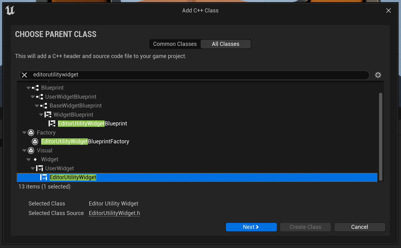 UEditorUtilityWidgets를 상속받는 위젯클래스를 만들어 사용할 것이다