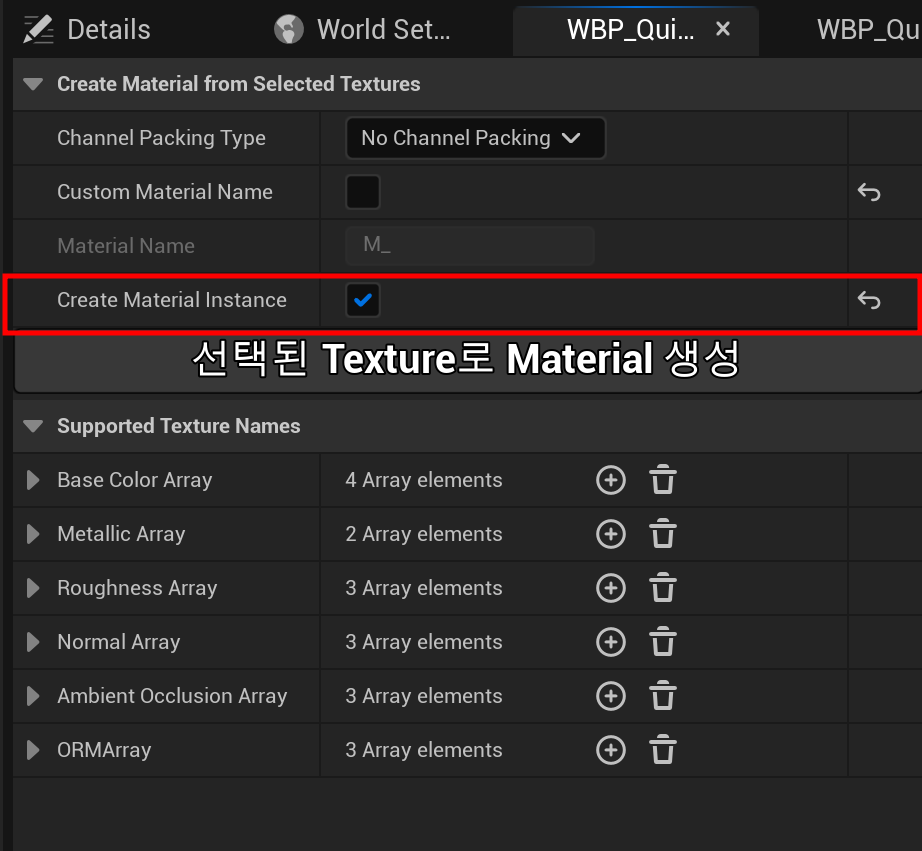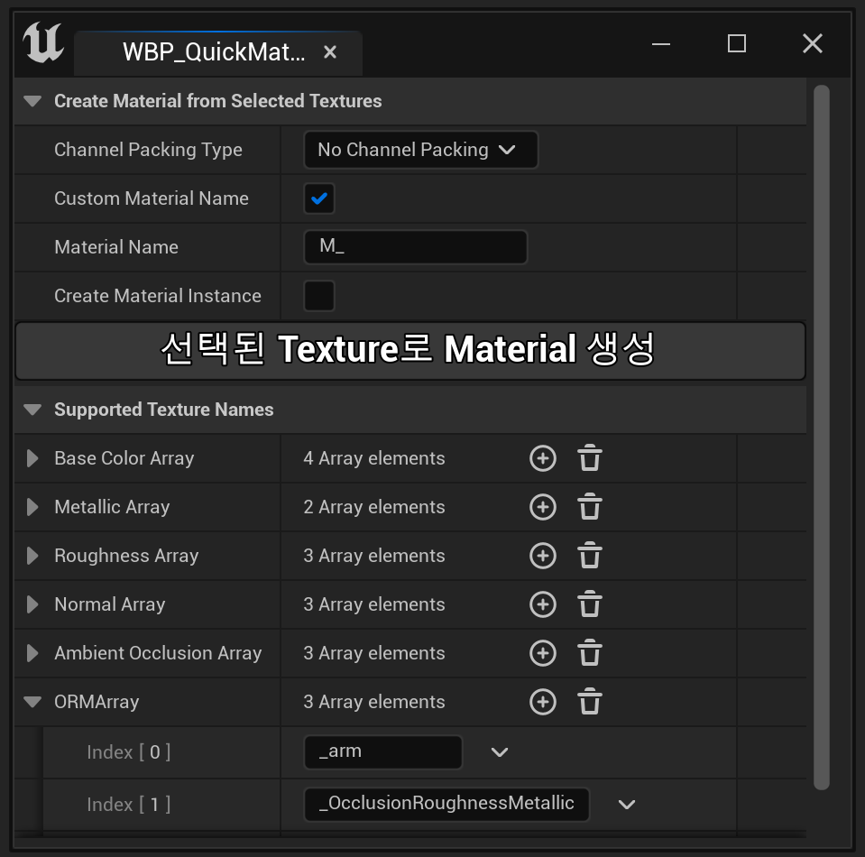 * bCustomMaterailName==true면 이름을 지을 수 있고, false면 Texture이름에 M_ 접두어를 붙인 이름으로 생성