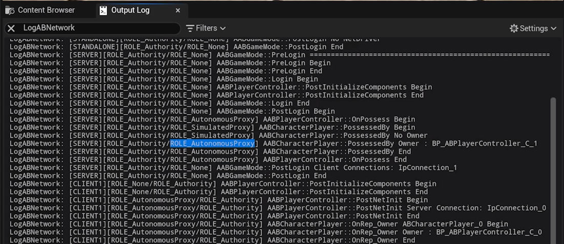 Autonomous Proxy | 예외적으로 입력에 관련된 로직을 수행할 수 있음. 입력에 관련된 게임 로직의 실행은 Authority와 Autonomous Proxy에서만 허용됨. UE API: - AControlller::IsLocalController - APawn::IsLocallyControlled |