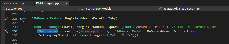 FExecuteAction::CreateRaw(this, &FSWManagerModule::OnDeleteUnsuedAssetButtonClicked) // 실행될 함수