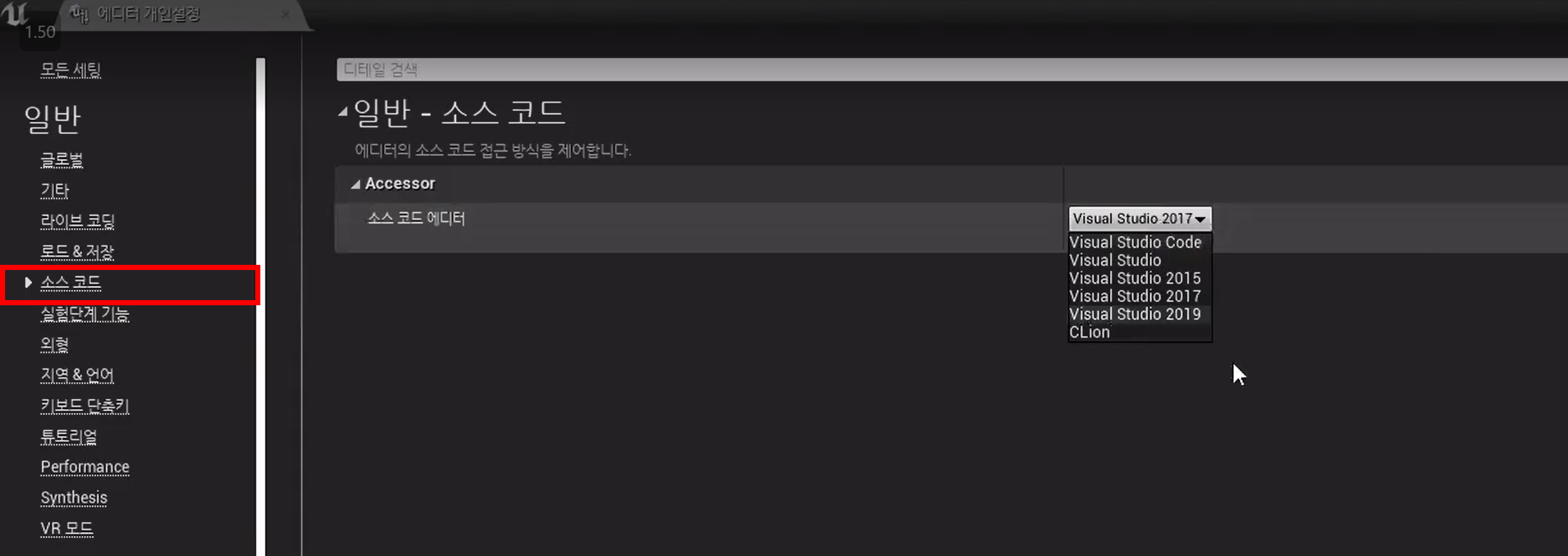 에디터 개인설정 - 소스 코드 - 사용할 IDE를 설정