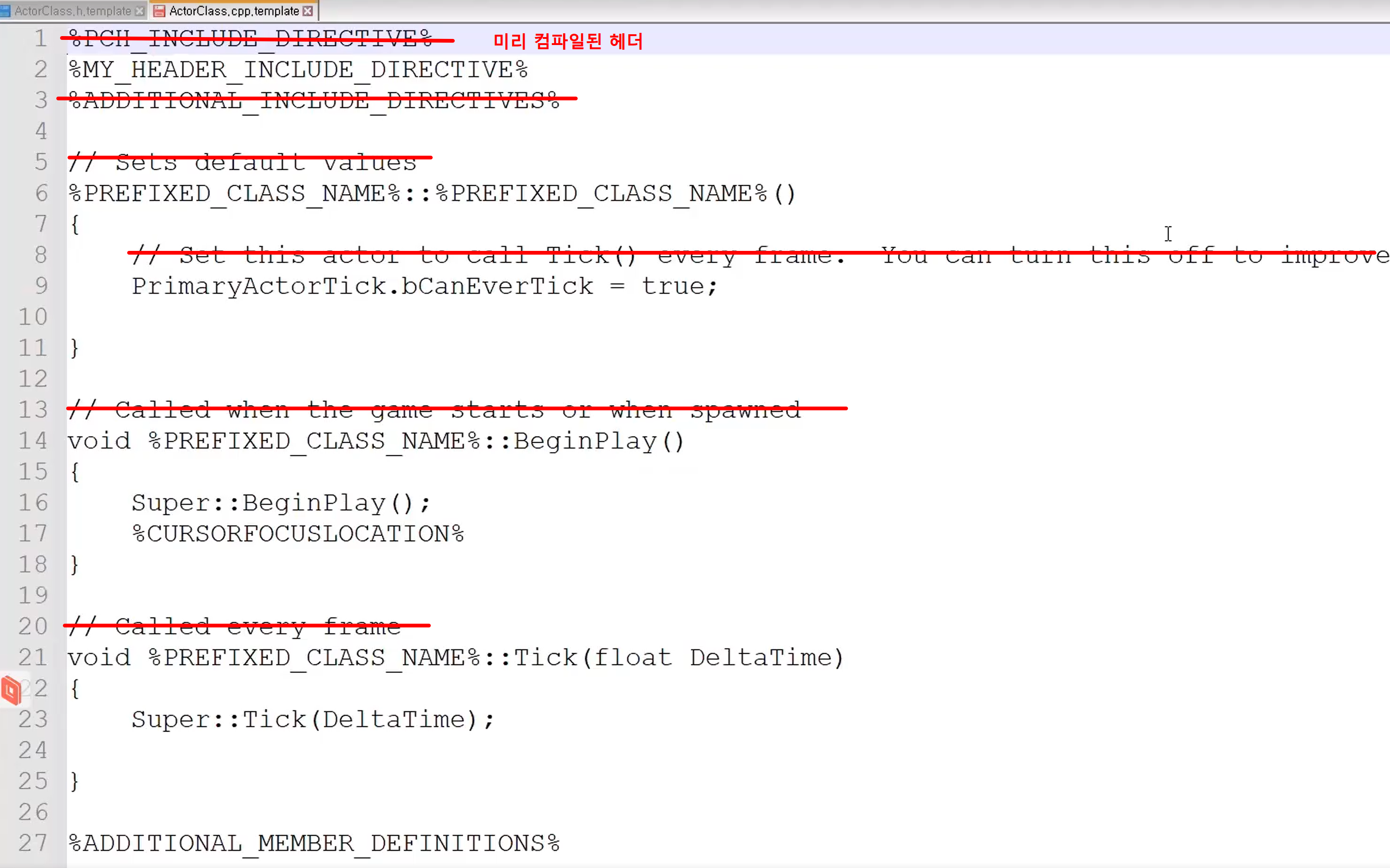 - Unreal 4.18부터는 모든 파일이 미리 컴파일된 헤더 취급된다. 따라서 %PCH INCLUDE DIRECTIVE%는 필요없다.