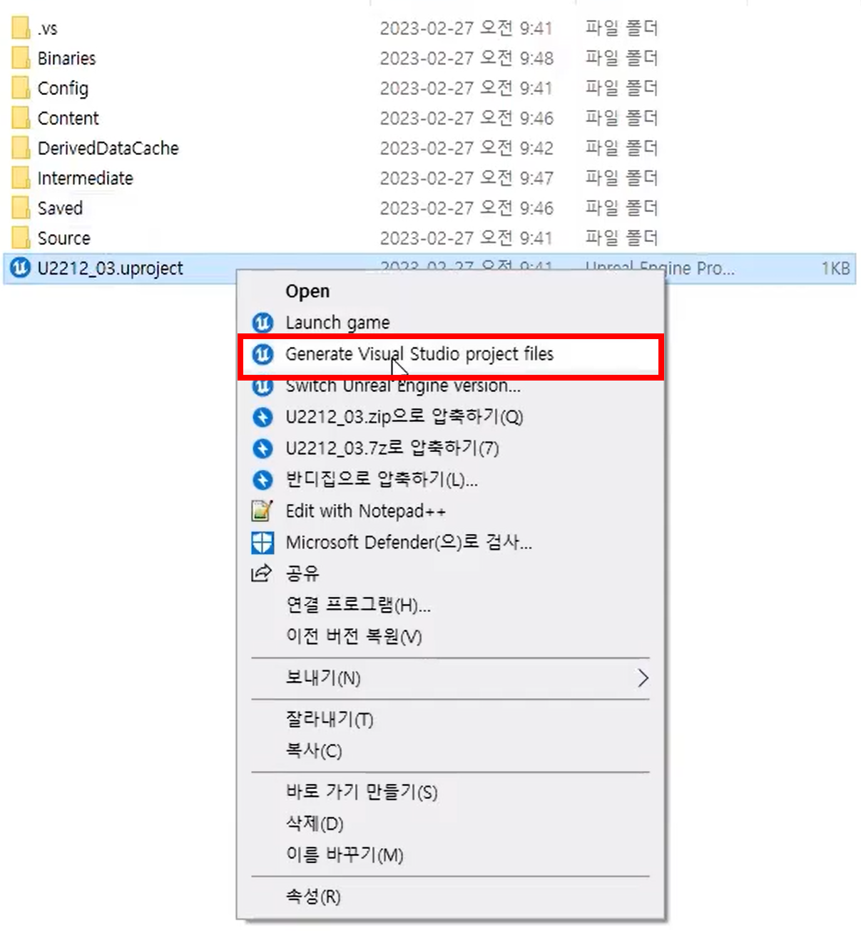 - 언리얼 실행파일 - 마우스 우클릭 - Generate Visual Studio project files 클릭