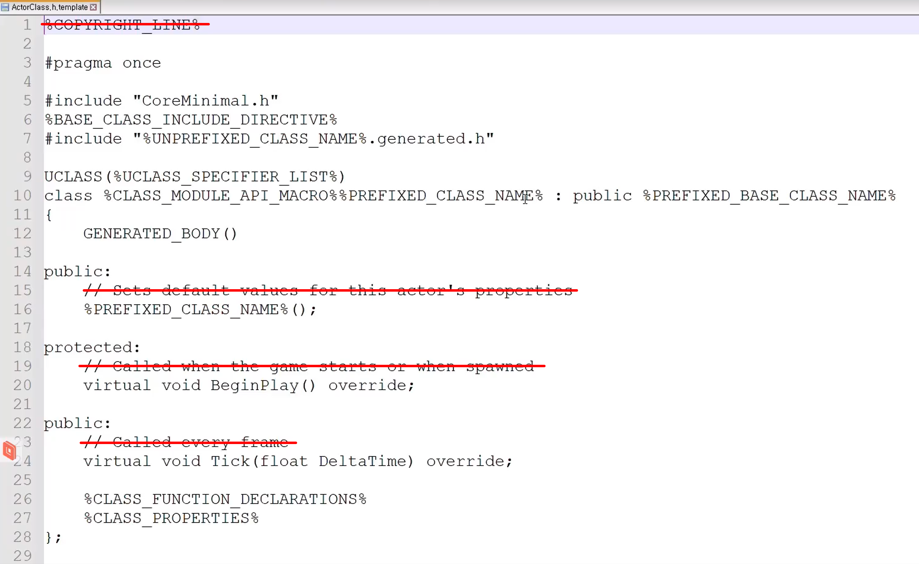 언리얼 엔진 저장위치 열어서 ActorClass.h와 ActorClass.cpp 내의 주석을 삭제하여 클래스가 생성될 때마다 주석이 생기는 것을 방지해주자.