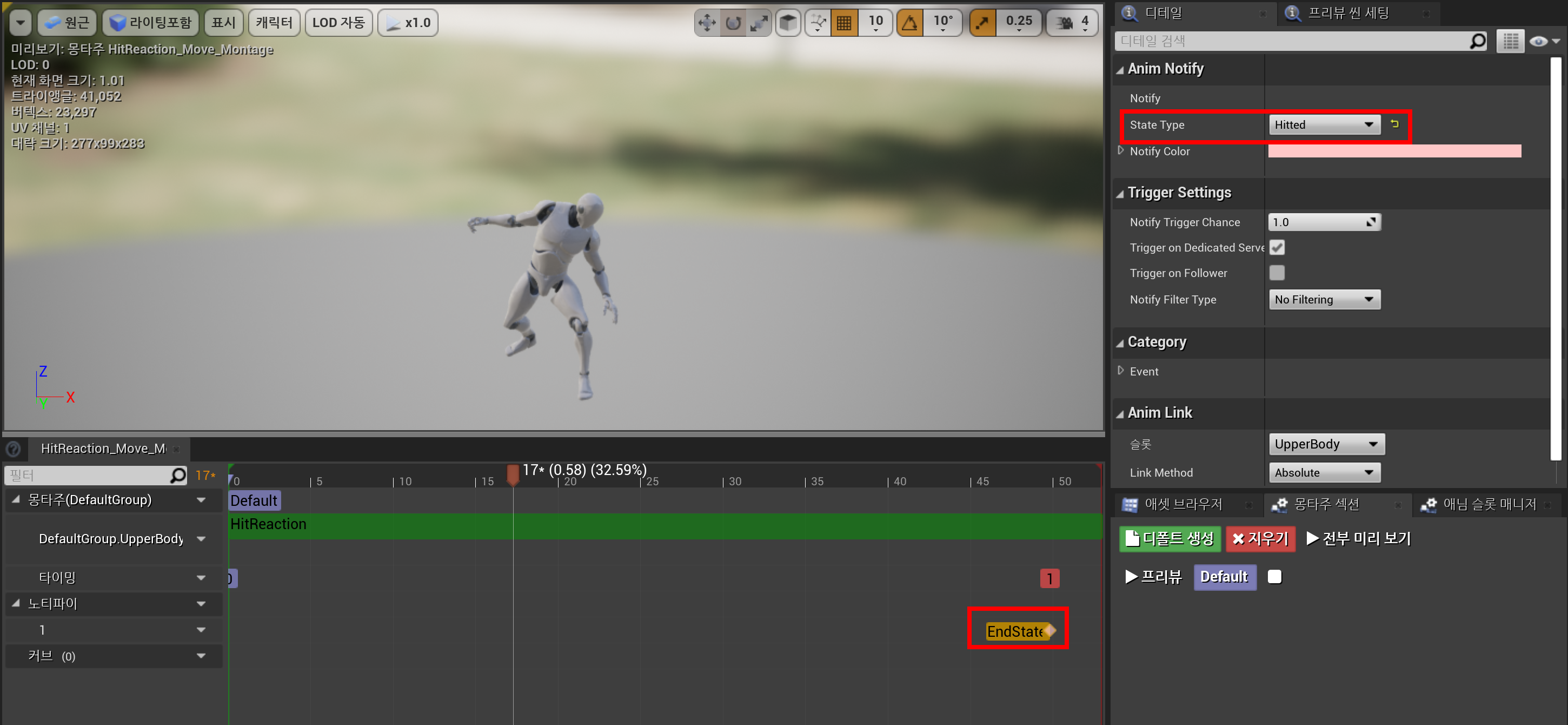 피격이 되는 몽타주들의 맨 뒤에 CAnimNotify_EndState를 넣고 State Type을 Hitted로 설정한다.