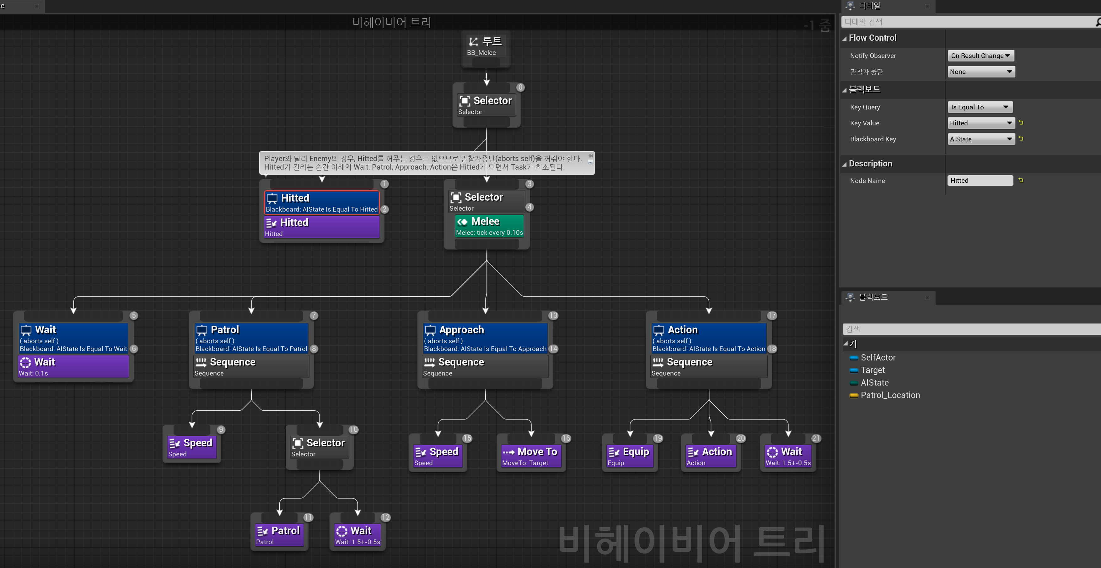 적(Enemy)의 피격과 Behavior Tree가 연결되어 있지 않다. 적이 피격 되었을 때 Behavior Tree에 알리고 피격이 끝났을 때 Behavior를 WaitMode로 변경하는 코드를 추가하였다.