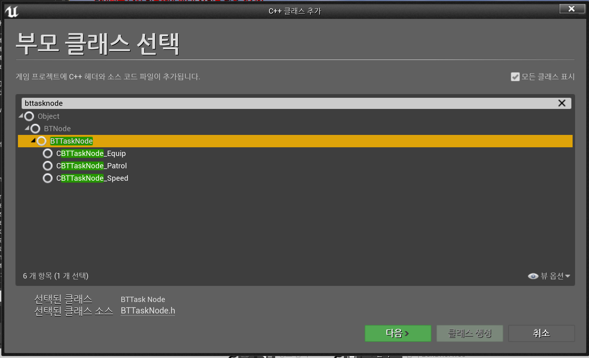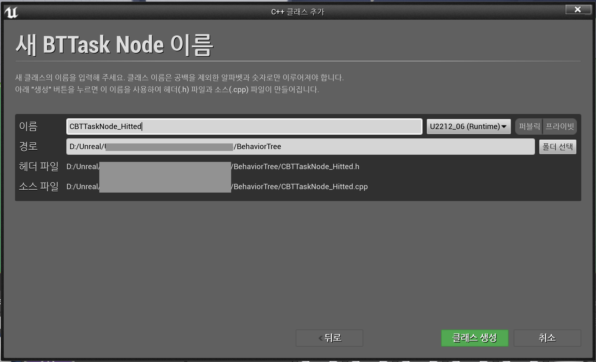 새 C++ 클래스 - BTTaskNode - CBTTaskNode_Hitted 생성
