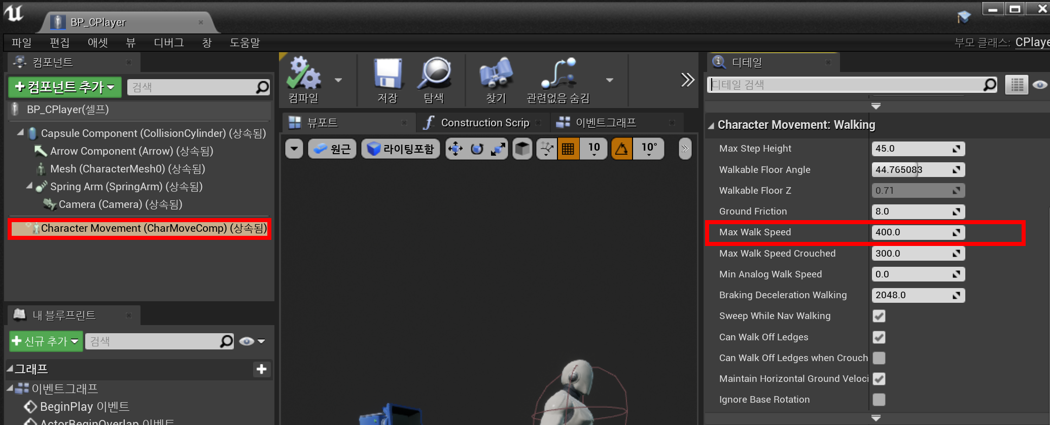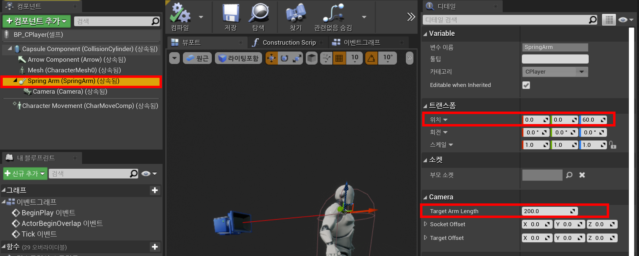 캐릭터인 CPlayer를 생성한 후 SpringArm, Camera, Mesh(SK_Mannequin)를 추가한다.