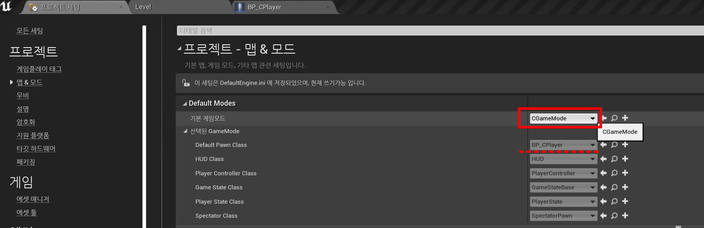 프로젝트 세팅 - 맵&모드 - 기본 게임모드 CGameMode로 변경.