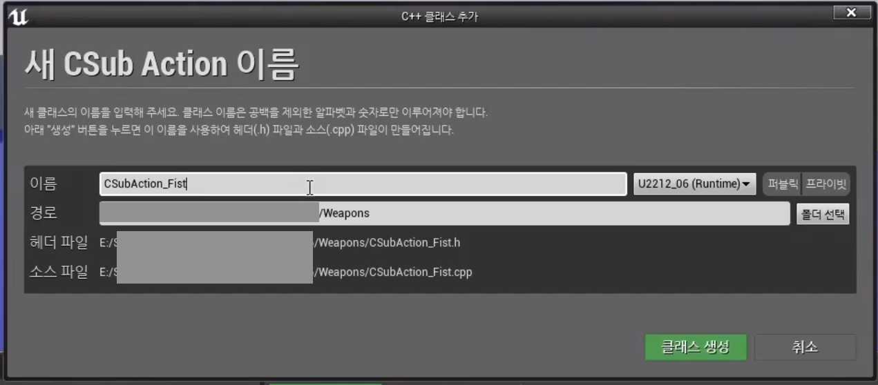 CSubAction 파생 C++ 클래스 생성 - CSubAction_Fist 생성