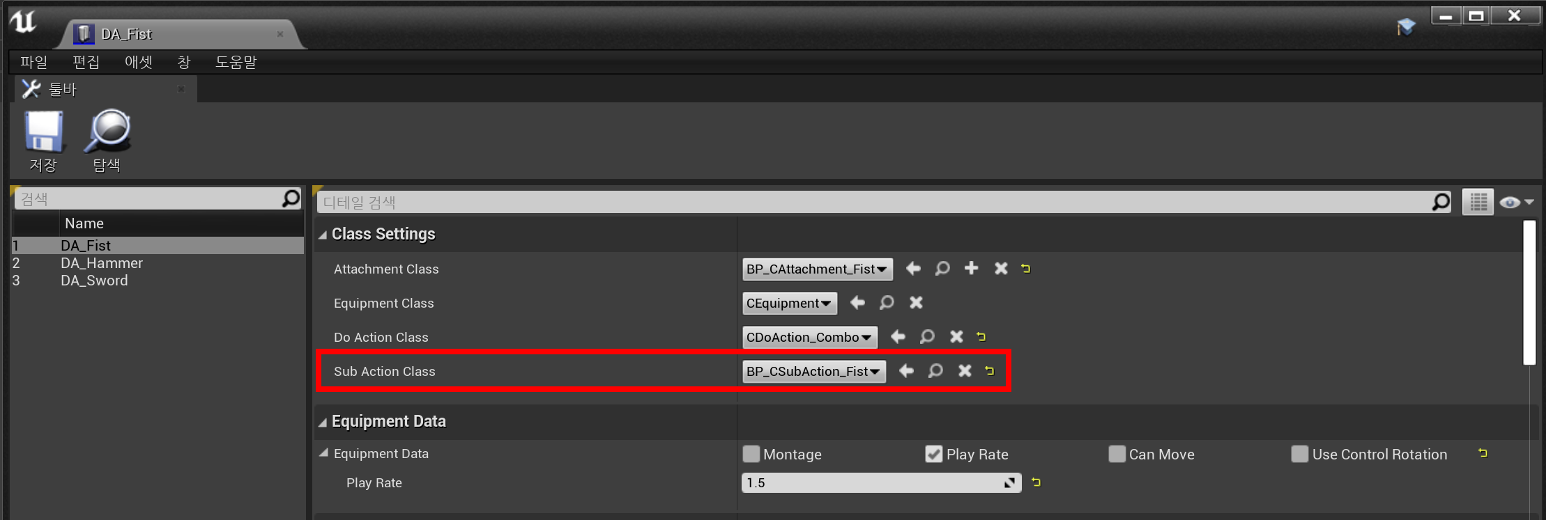 BP_CSubAction_Fist 에 Action Data를 넣어준다.