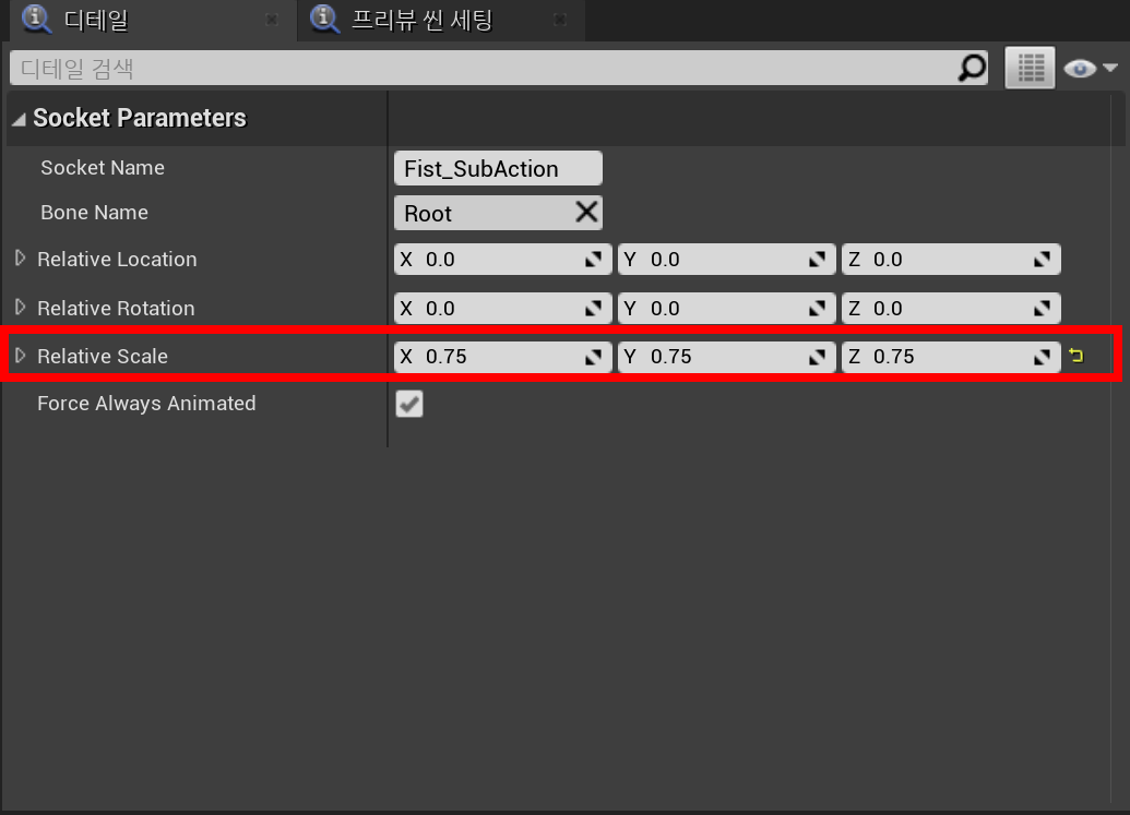 - Timed Particle Effect에서 파티클 이펙트의 크기를 조절할 수 없기 때문에 소켓을 생성해서 넣어주는 방식으로 해결하였다. 소켓에서는 파티클 이펙트의 스케일 조정이 가능하다.