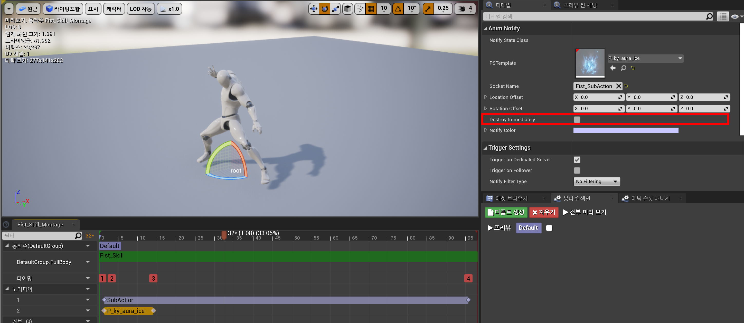 - Destroy Immediately 옵션을 체크하면 이펙트 내부 시간설정과 상관없이 AnimNotifyState이 끝나면 이펙트가 즉시 사라진다.