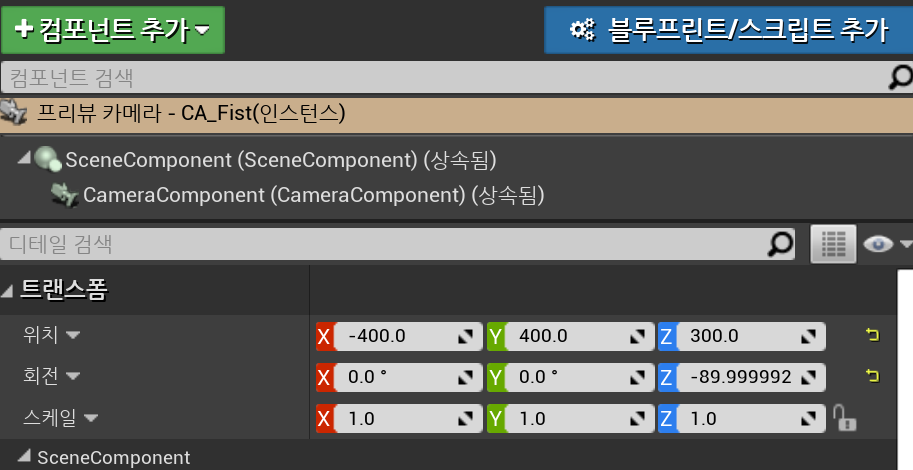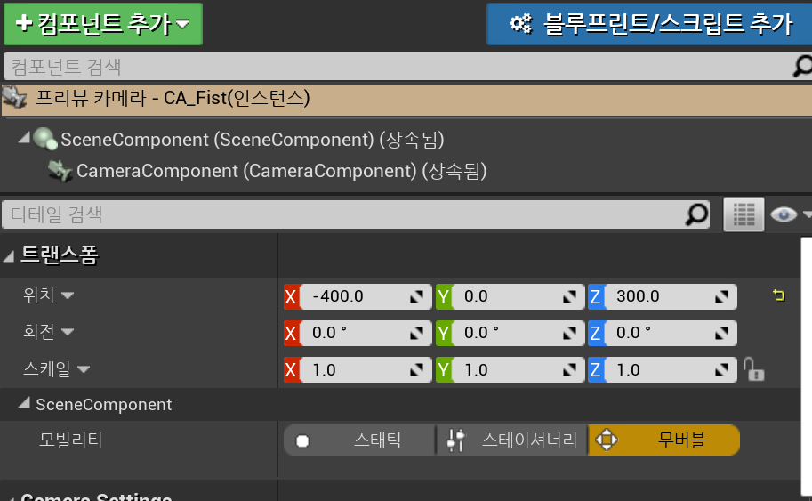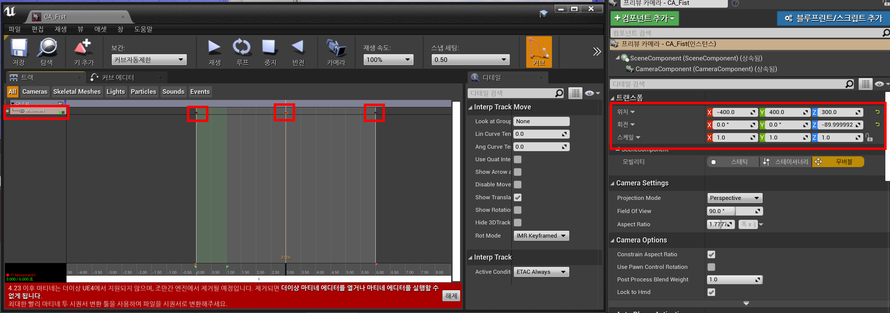 - Blend out Time: 0.0 설정. Animation 카메라에서 원래 카메라로 전환되는 시간
