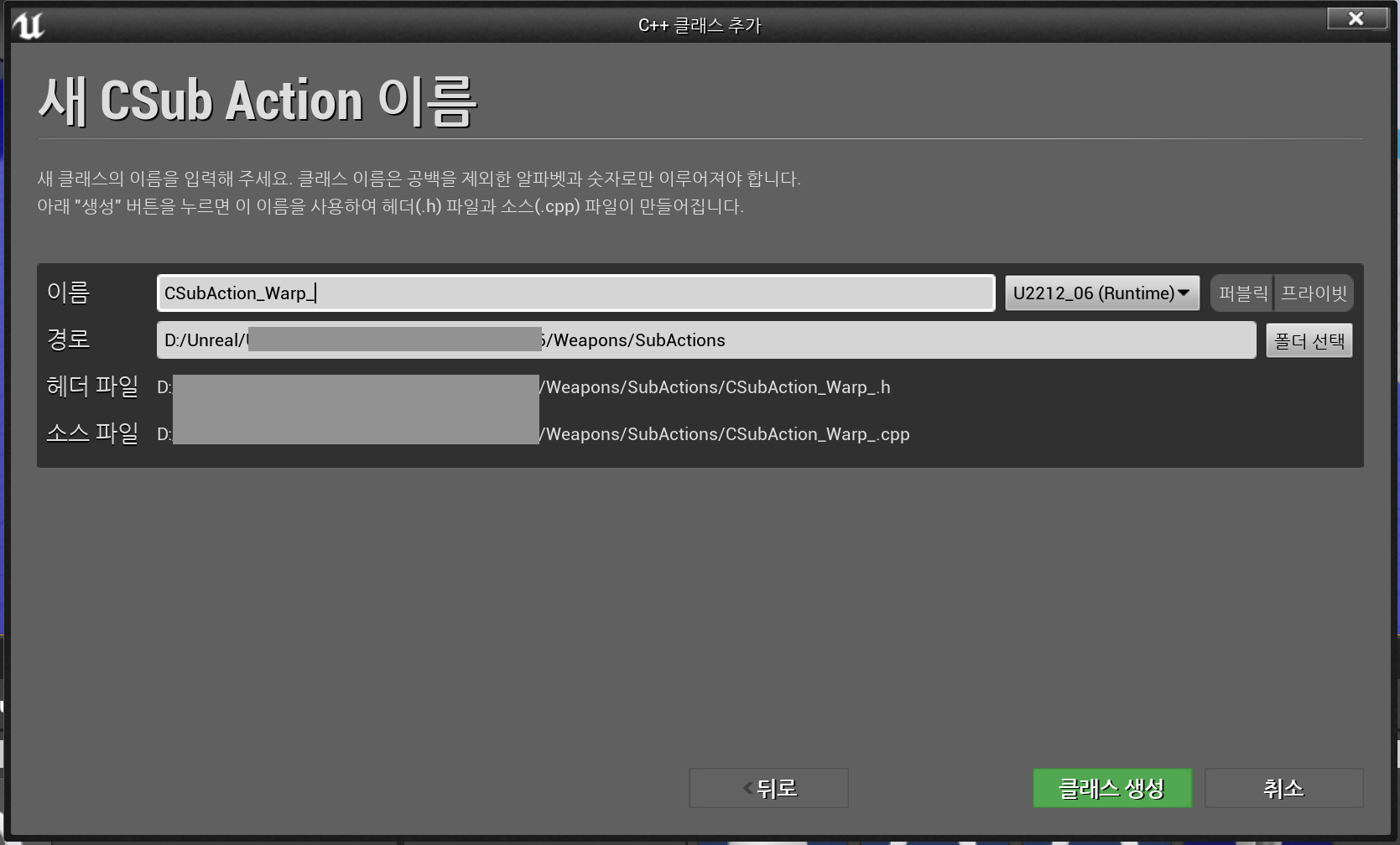 새 C++ 클래스 - CSubAction - CSubAction_Warp 생성