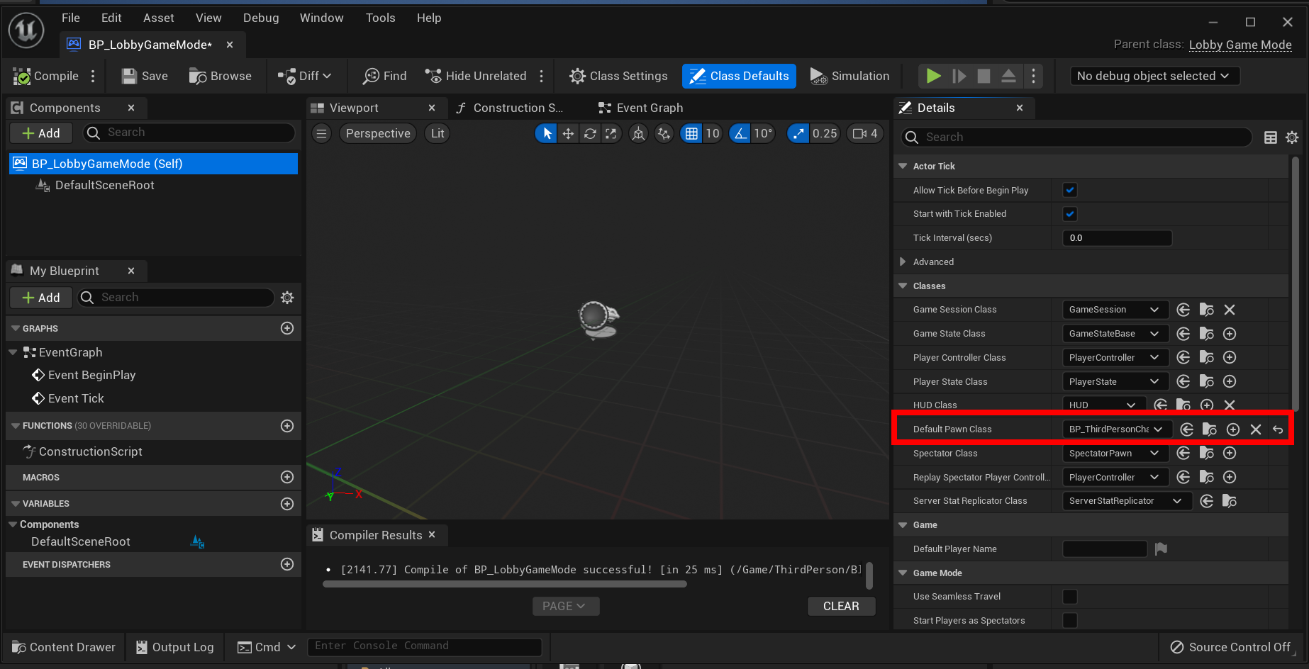 Default Pawn Class: BP_ThirdPersonCharacter로 변경