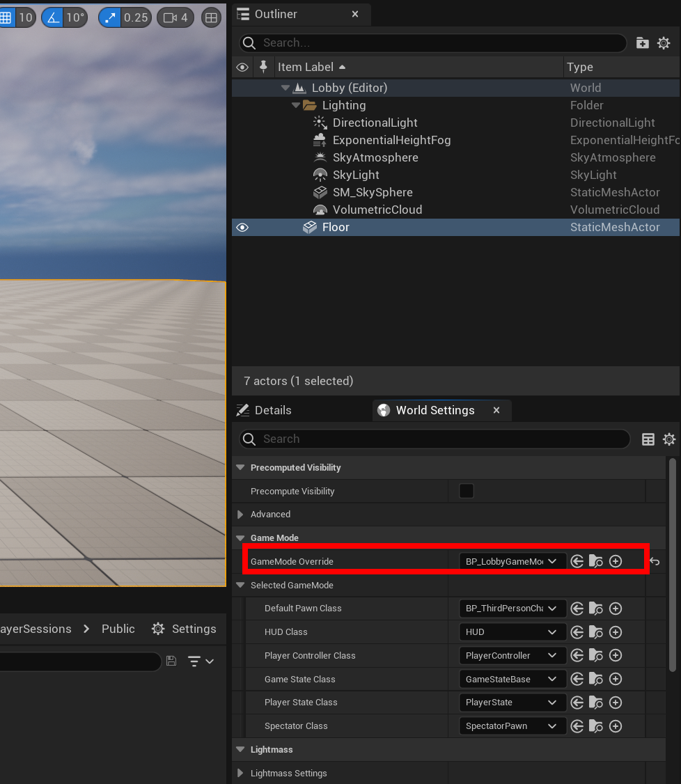 World Settings에 Game Mode를 BP_LobbyGameMode로 변경하기