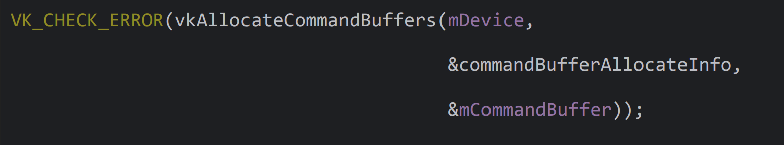 VK_CHECK_ERROR(vkAllocateCommandBuffers(mDevice, &commandBufferAllocateInfo, &mCommandBuffer));