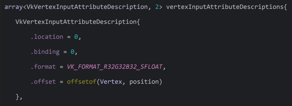 - 첫번째 Attribute는 Vertex Shader의 location 0에 연결된다. 이 Attribute는 0번 바인딩된 Buffer로부터 읽어오고, Offset은 Vertex 구조체의 포지션만큼 되어 있고, format은 VK_FORMAT_R32G32B32_SFLOAT인 103 타입이다.