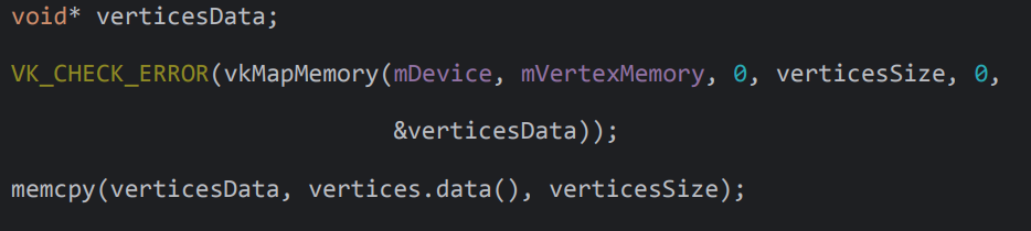 vkMapMemory를 호출하여 HOST가 접근 가능한 가상 주소를 얻어온다. 그리고 memcpy를 사용해서 vertex 데이터를 복사한다.