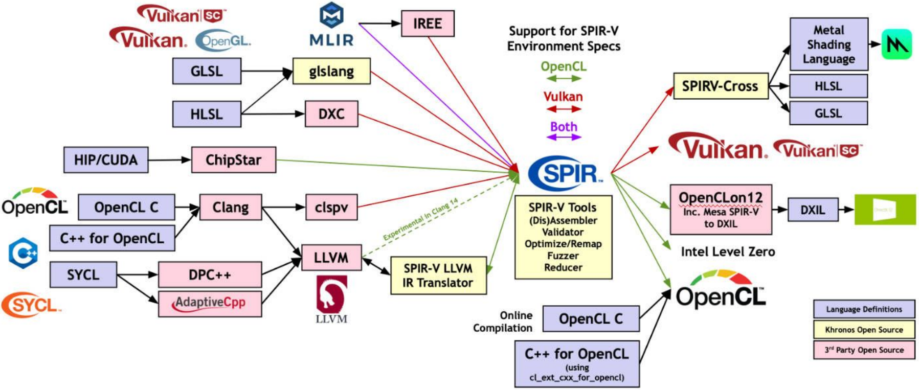 다양한 언어가 SPIR로 컴파일되고 컴파일된 SPIR는 다양한 API에서 작동한다. 또한 SPIR는 LLVM을 기반이기 때문에 LLVM의 다양한 최적화 패스를 손쉽게 적용할 수 있다.