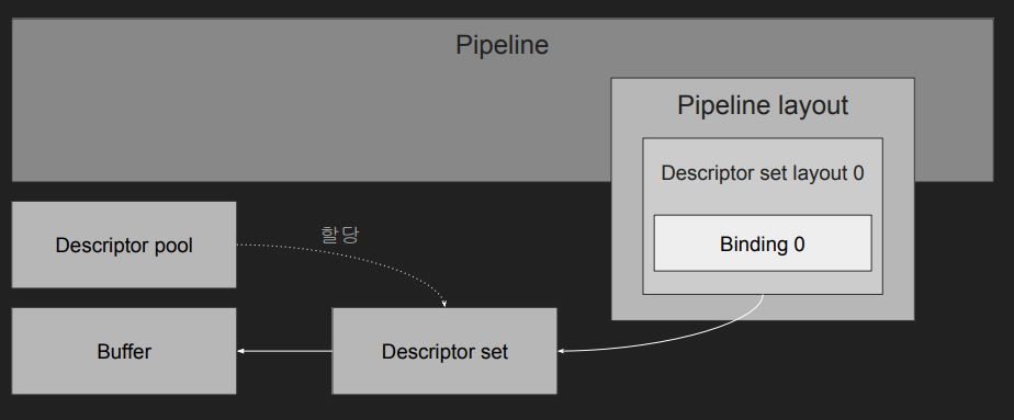 Descriptor set layout은 어떤 리소스가 사용할 수 있다는 것을 정의하지만 실제로어떤 리소스가 바인딩 될지에 대한 정보는 포함하고 있지 않다. 리소스의 실제 바인딩은 Desciptor set을 통해 이루어진다. 이 Descriptor set은 Descriptor pool로부터 할당 받을 수 있다.