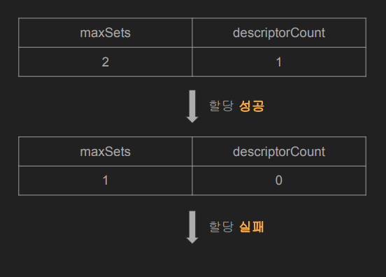 두 번째의 경우 maxSets는 1개지만 descriptorCount가 0이므로 할당이 실패한다.
