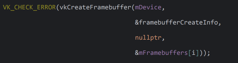 VK_CHECK_ERROR(vkCreateFramebuffer(mDevice, &framebufferCreateInfo, nullptr, &mFramebuffers[i])); // mFramebuffers[i] 생성
