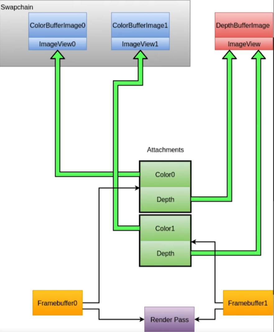 해당 이미지 예시의 경우, 2개의 Framebuffer가 Render Pass를 가리키고 있다.