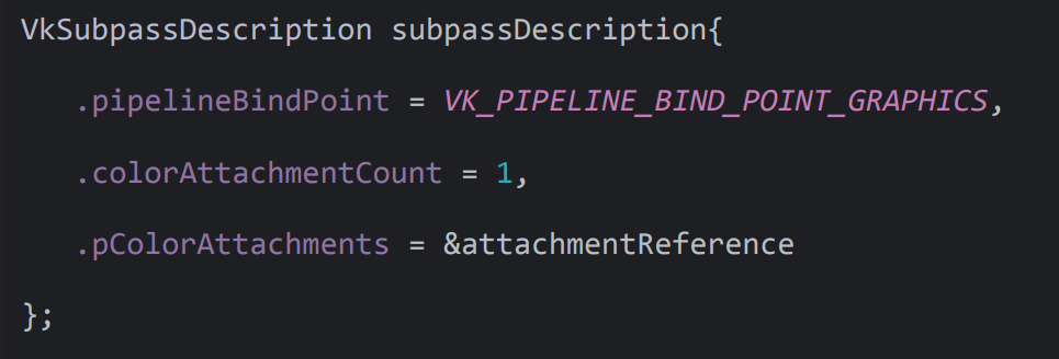 | subpassCount | VkSubpassDescription의 개수. 아래의 예제 코드에서는 1 사용. |