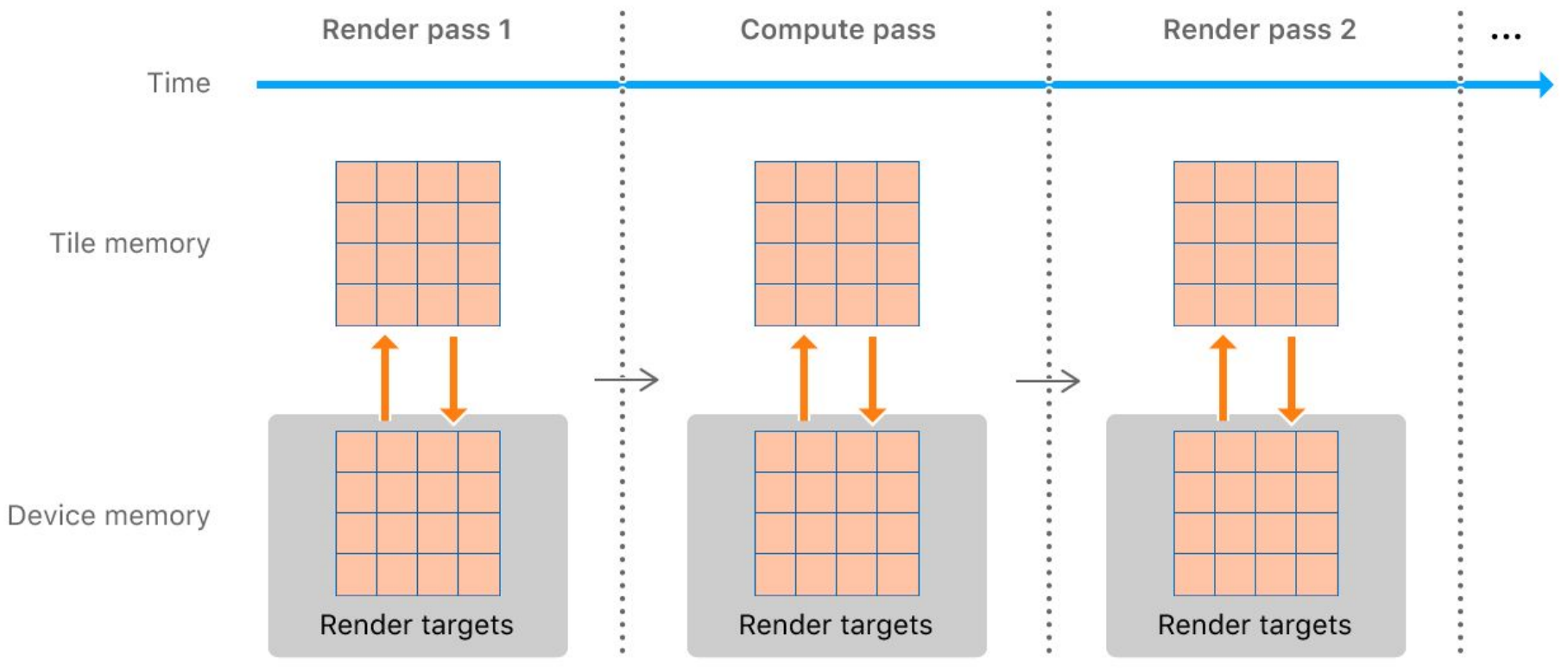 GPU는 VRAM을 가지고 있으며 Vulkan에서는 이를 Device memory라고 부른다. GPU에서 작업을 수행하기 위해서는 데이터가 Device memory에서 Tile memory로 전송되어야 한다.