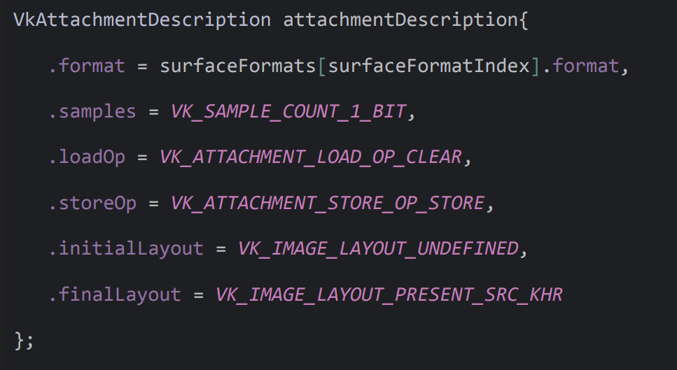 이 구조체는 프레임 버퍼의 Attachment에 대한 세부 정보를 기술하며 Format, Sample, Image Layout 등의 정보를 포함한다.