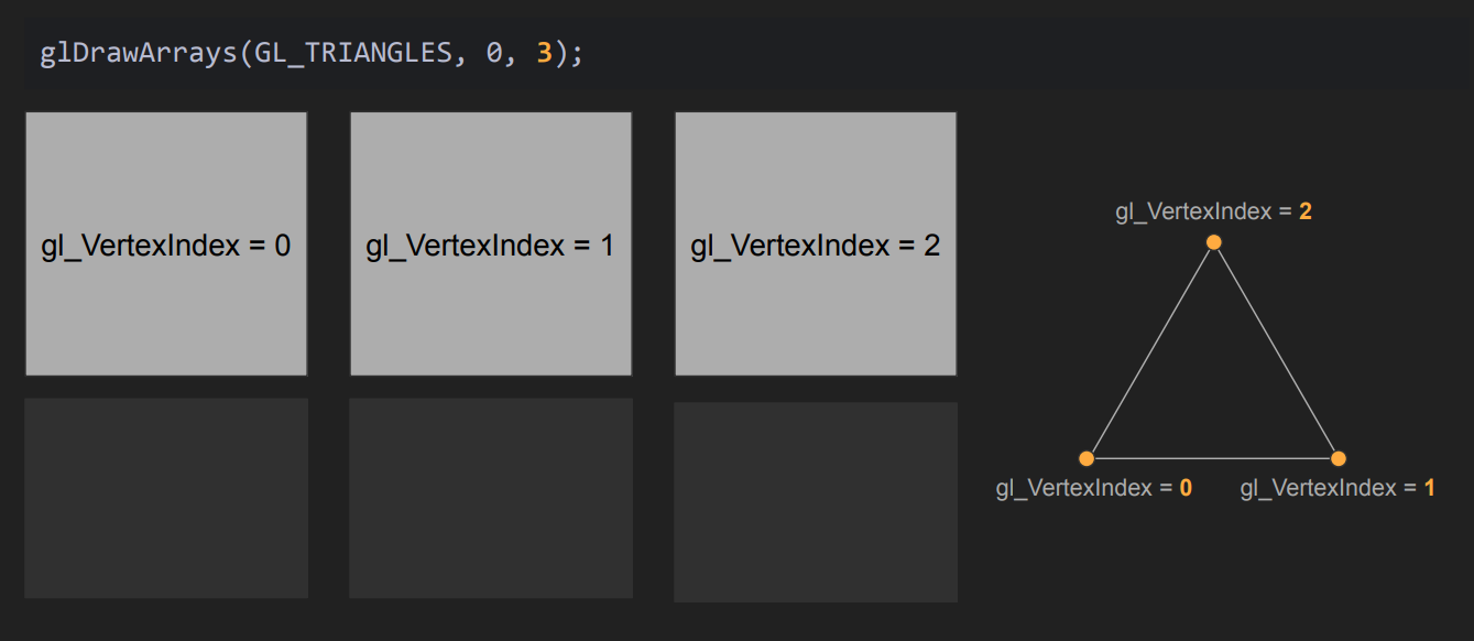예들 들어, glDrawArrays의 함수를 호출할 때 그릴 정점의 수를 3으로 설정한다. 그러면 Vertex Shader의 각 스레드에서 Vertex Index의 값이 0, 1, 2로 설정된다. 이 정보를 삼각형에 적용하면 위의 그림과 같이 설정된다. 삼각형의 각 정점에 고유한 Index가 설정된다.