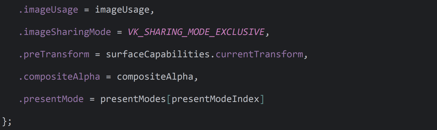 typedef struct VkSwapchainCreateInfoKHR { VkStructureType sType; const void* pNext; VkSwapchainCreateFlagsKHR flags; VkSurfaceKHR surface; uint32_t minImageCount; VkFormat imageFormat; VkColorSpaceKHR imageColorSpace; VkExtent2D imageExtent; uint32_t imageArrayLayers; VkImageUsageFlags imageUsage; VkSharingMode imageSharingMode; uint32_t queueFamilyIndexCount; const uint32_t* pQueueFamilyIndices; VkSurfaceTransformFlagBitsKHR preTransform; VkCompositeAlphaFlagBitsKHR compositeAlpha; VkPresentModeKHR presentMode; VkBool32 clipped; VkSwapchainKHR oldSwapchain; } VkSwapchainCreateInfoKHR