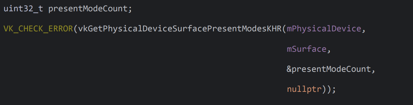 사용 가능한 PresentMode의 수(=PresentModeCount)를 알아내기 위해 vkGetPhysicalDeviceSurfacePresentModeKHR 함수를 호출한다. 이 때, 마지막 인자로 nullptr를 전달함으로써 사용 가능한 presentModeCount를 얻어온다.
