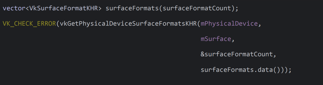 vkGetPhysicalDeviceSurfaceFormatsKHR 함수를 호출하여 실제로 사용 가능한 surfaceFormats.data()를 얻는다.