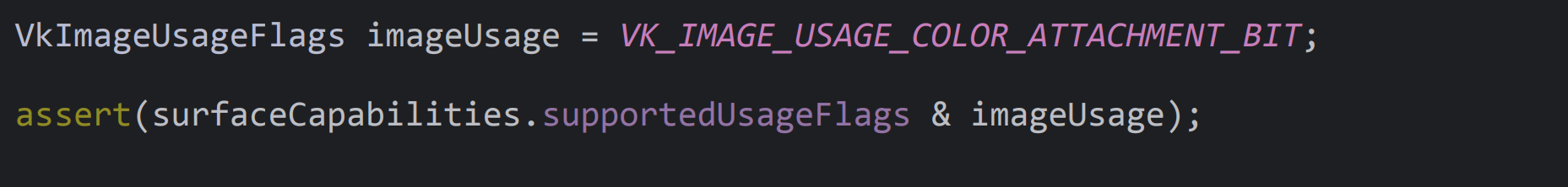 surfaceCapabilities.supportedUsageFlags와 이미지를 & 연산을 수행해서 VK_IMAGE_COLOR_ATTACHMENT_BIT이 지원되는지 확