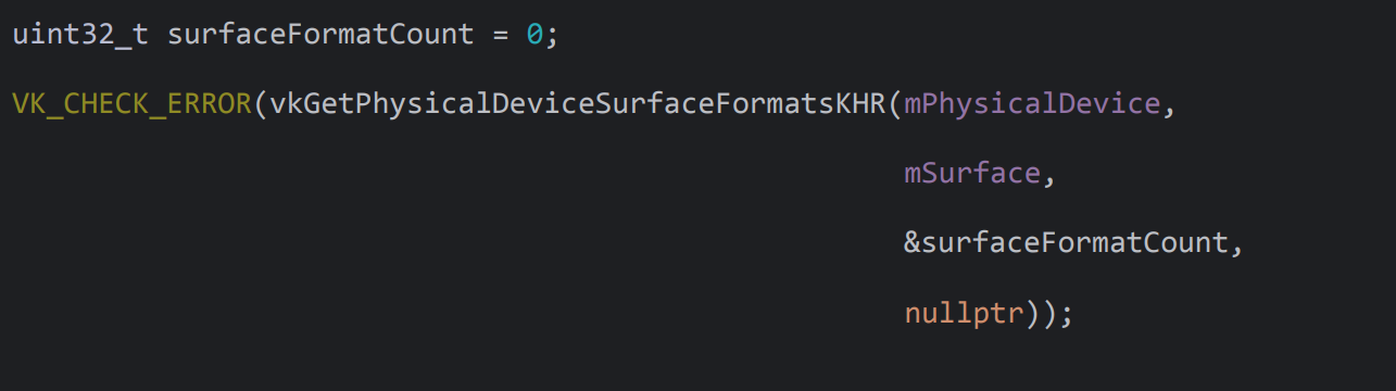 사용 가능한 surfaceFormat의 수(=surfaceFormatCount)를 알아내기 위해 vkGetPhysicalDeviceSurfaceFormatsKHR 함수를 호출한다. 이 때, 마지막 인자로 nullptr를 전달함으로써 사용 가능한 surfaceFormatCount를 얻어온다.