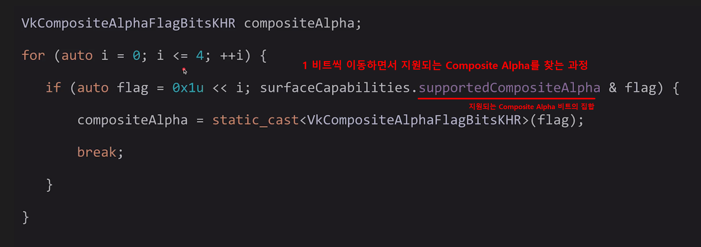 사용할 수 있는 Vulkan Composite Alpha 찾기