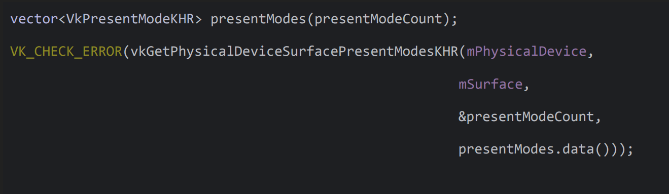 vkGetPhysicalDeviceSurfacePresentModeKHR 함수를 호출하여 실제로 사용 가능한 presentModes.data()를 얻는다.
