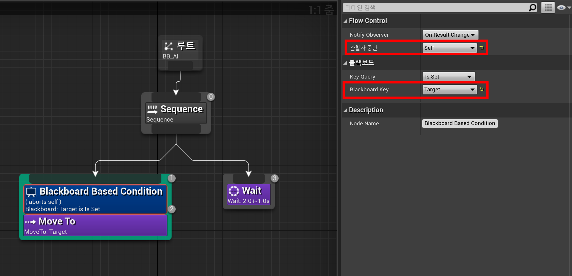 - Blackboard Key: Target으로 변경. Target is Is Set이면 실행하겠다는 의미. Target이 NULL이면 실행하지 않고 중단해버림.
