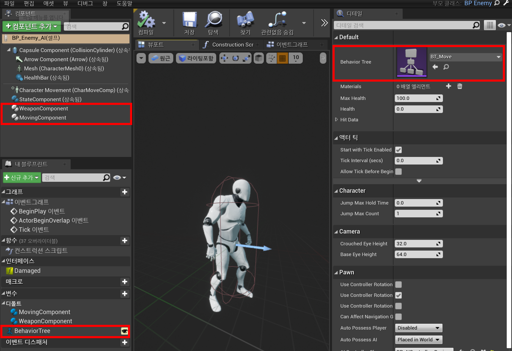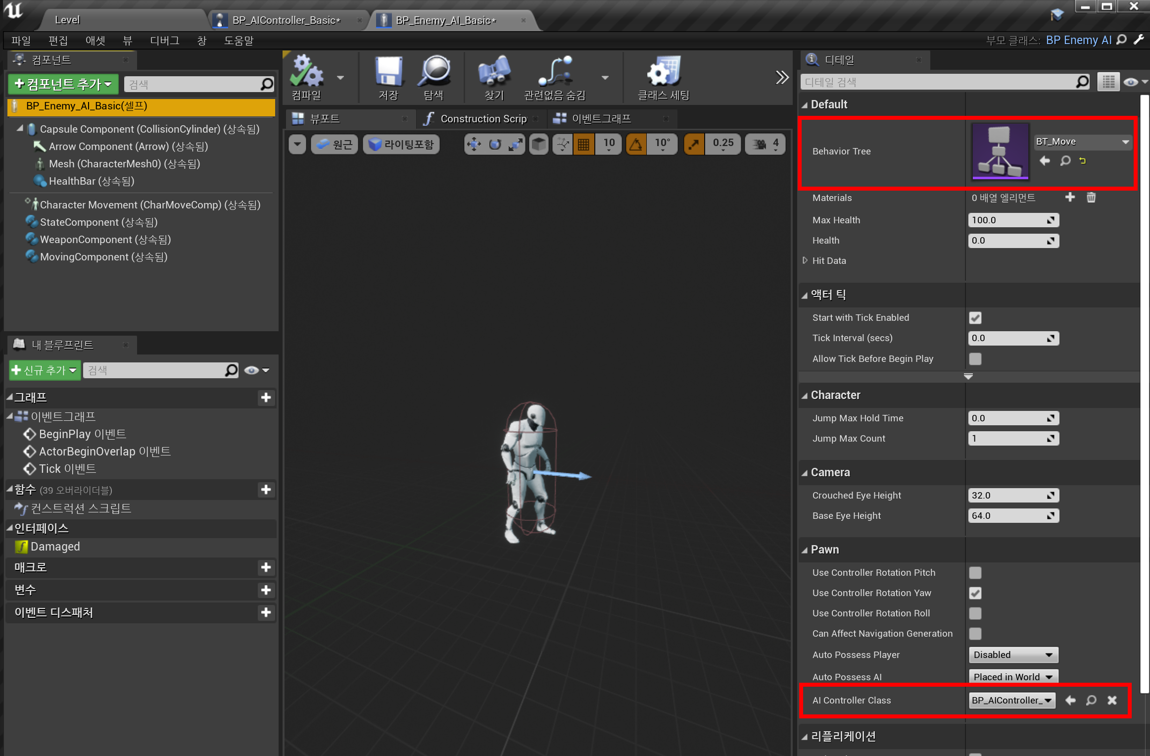 - BP_Enemy_AI_Basic(셀프) - Pawn - AI Controller Class - Auto Posses AI